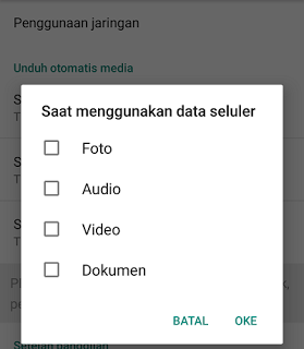 Buang checklist  untuk semua media, Foto, audia, video dan dokument, lalu klik OKE. jika menghendaki lakukan hal yang sama pada mode “Saat menggunakan Wifi”