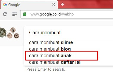 Pengambilan judul ini berawal dari rasa penasaran saya saat mengetikan kata kunci pada mesin pencari google, ketika kita ketikan “Cara membuat” search sugest memunculan kata yg paling sering digunakan salah satunya kata kunci ini, CARA MEMBUAT ANAK,