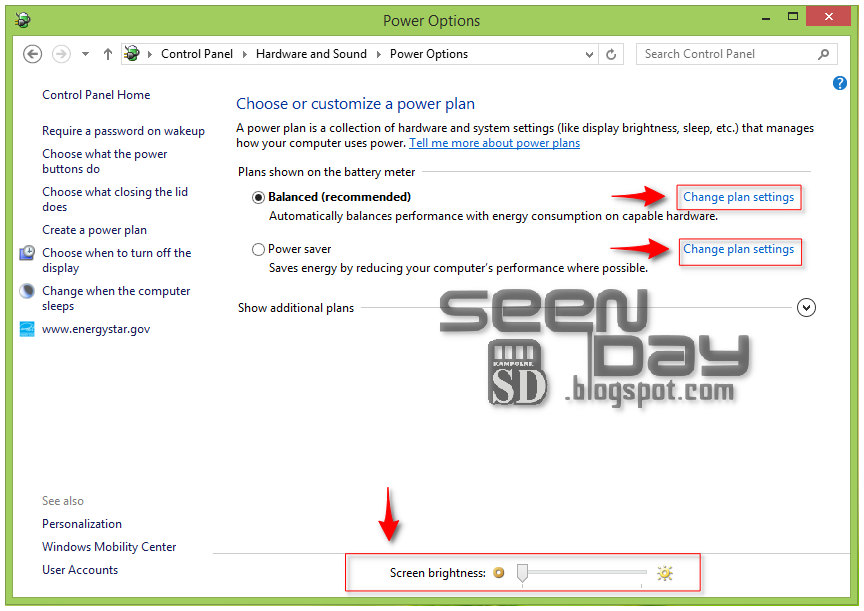 Nah, Untuk mengatur pencahayaan atau kecerahan kita bisa masuk pada menu ini, buka salah satu Profil Daya (yang sedan kita Gunakan) denan mengklik “Change plan Settings” (lihat gambar diatas).