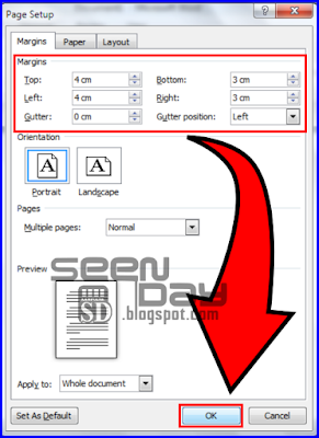• Setelah itu akan tampil dialog jendela baru tentang pengaturan margin ini, disana akan terdapat  tiga tab pengaturan, karena kita hendak mengatur ukuran margin maka biarkan saja pada tab margin. Karena akan membuat ukuran margin 4 4 3 3 atau 4 3 4 3,