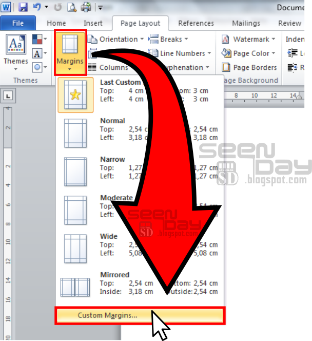 • Setelah terbuka tab “PAGE LAYOUT” kemudian pilih “MARGIN” (pada setiap versi office mungkin saja berbeda letak dan icon-nya), maka disana akan terdapat banyak  pilihan ukuran margin yang disediakan template word. Karena tidak ada ukuran 4343 / 4433 disana. kita pilih pada “COSTUM MARGIN