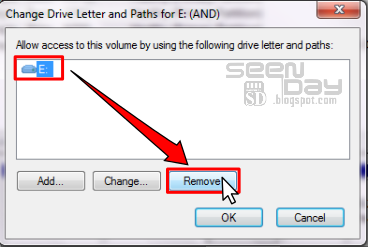 Disini saya akan menyembunyikan partisi “E” dengan label disk “AND”, Klik kanan lalu pilih “Change Drive Letter and Paths”