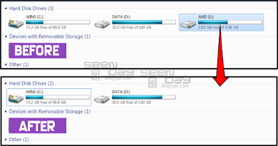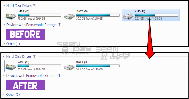 5. Nah, sekarang sudah selesai, silahkan tutup disk management, silahkan periksa di windows explorer partisi tadi pasti sudah lenyap dari pandangan alias tersembunyi.