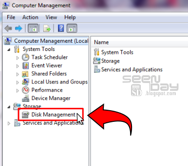 2. Jendela “Computer Management” akan terbuka dan silahkan pilih “Disk Management” hingga tampil deretan drive yang ada di komputer