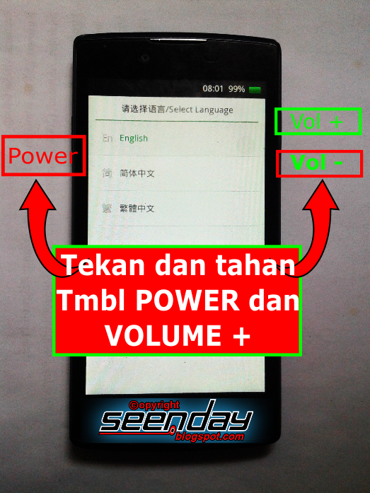 Caranya, saat hape dalam keadaan mati dan batu terpasang. Tekan dan tahan Volum Bawah beserta Tombol Power secara bersamaan hingga ada tampilan “recovery mode”.