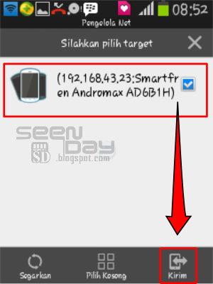 3. Aplikasi akan mencari smartphone yang terkoneksi dengan identitas protokol (IP) dan mana perangkat hape, setelah ditemui, pilih dan tekan kirim.