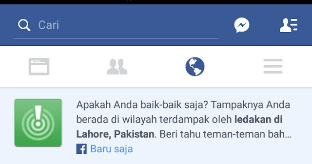 Anda mendapatkan pemeritahuan seperti ini dari Facebook (FB) “Apakah anda baik-baik saja? Tampaknya anda berada di wilayah terdampak oleh ledakan di Lahore, Pakistan, beri tahu teman-teman bahwa anda dalam keadaan aman” atau dalam notifikasi bahasa inggris berbunyi “Are you OK? it looks like you’re in the area affectedby The Explosion in Gulshan -l-Iqbal Park, Lahore, Pakistan. Let Friends know that yaou’re safe” tahukah apakah maksud pemberitahuan pihak FB tersebut ?