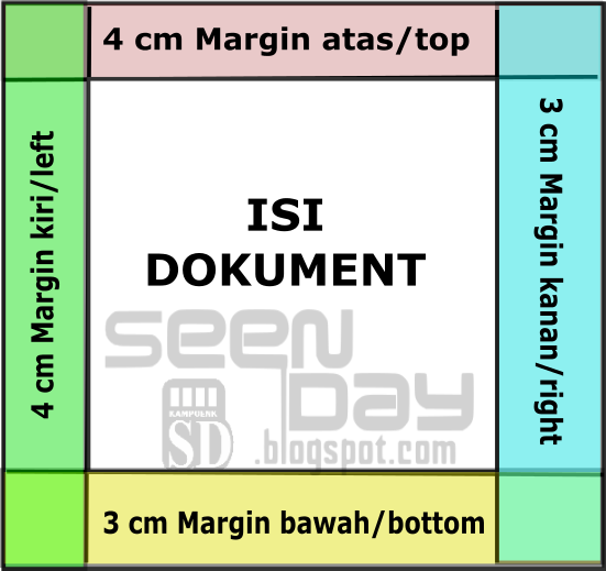 Karena tadi dikatakan bahwa margin adalah jarak atau ruang pembatas. Maka 4 4 3 3 adalah ukuran jarak margin dalam satuan centimeter (cm) dengan rincian sebagai berikut :