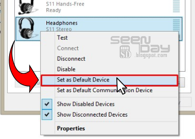 Jika terdapat dua mana yang sama, silahkan cek terlebih dahulu mana yang mengeluarkan suara dengan cara klik lama pada device lalu pilih “Test” setelah diketahui mana yang berfungsi, untuk mengaktifkannya, KLIK KANAN lalu “Set as Default Device”