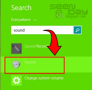 Ketikan “sound” pada pencarian (untuk win 8) atau di menu start (untuk win 7) laut pilih “sound”