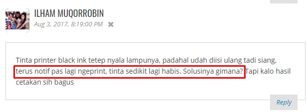 Tinta printer black ink tetep nyala lampunya, padahal udah diisi ulang tadi siang, terus notif pas lagi ngeprint, tinta sedikit lagi habis. Solusinya gimana? Tapi kalo hasil cetakan sih bagus